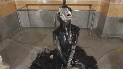 After being painted gold, this time she will turn silver. It seems her body will be painted half by half, creating a half-metal look.